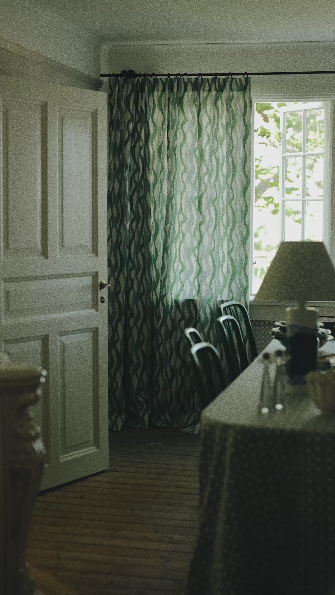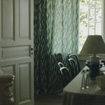 Part of the Karin Larsson collection, the pattern Portiere is inspired by Karin's textile work. One of her most famous pieces is the beautiful woven portiere between Karin and Carl’s bedrooms, called The Rose of Love. At the bottom, Karin had woven a few asymmetrical waves which caught Cathy’s attention. Inspired by the overlapping organic shapes and the stream running outside Karin’s bedroom window, she created this abstract, wavy print. Cathy’s waves are vertical instead of horizontal and the color scheme is inspired by the nature surrounding Lilla Hyttnäs.