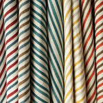 Anna-Lisa Thomson was one of Sweden’s most prominent ceramists, working a large portion of her life at the Upsala-Ekeby ceramic factory where she started working in 1933. Her work was innovative, testing new materials and decorative techniques and she won multiple awards and gained recognition not only in Sweden but also internationally. She developed a signature style with round, organic shapes, often with her very distinctive green glaze. Cathy has collected her ceramics for years and when she came over a large floor vase in a pattern with horizontal and vertical stripes, she was compelled to make her own stripe inspired by this composition. Our fabric Anna-Lisa is an homage to her work.