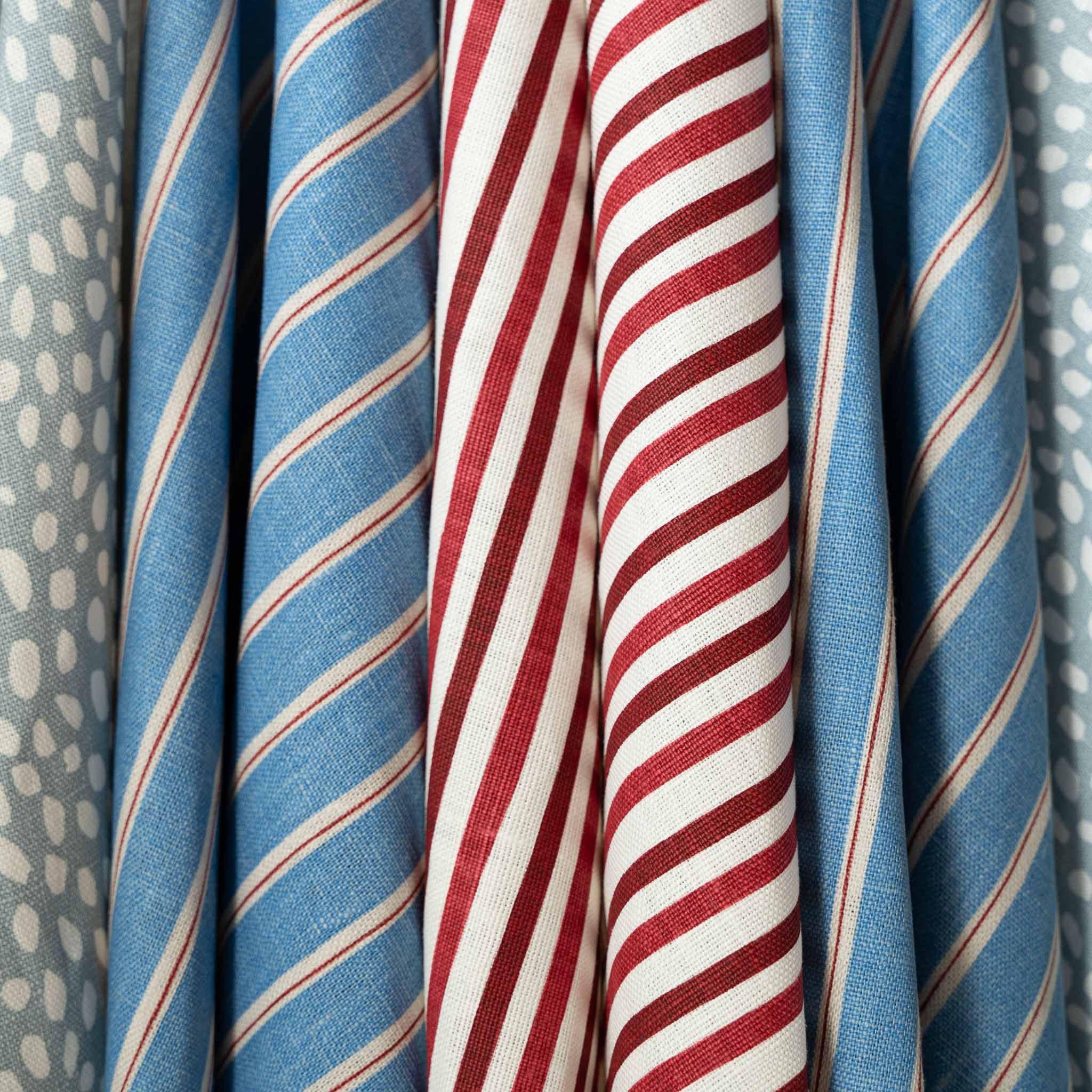 Anna-Lisa Thomson was one of Sweden’s most prominent ceramists, working a large portion of her life at the Upsala-Ekeby ceramic factory where she started working in 1933. Her work was innovative, testing new materials and decorative techniques and she won multiple awards and gained recognition not only in Sweden but also internationally. She developed a signature style with round, organic shapes, often with her very distinctive green glaze. Cathy has collected her ceramics for years and when she came over a large floor vase in a pattern with horizontal and vertical stripes, she was compelled to make her own stripe inspired by this composition. Our fabric Anna-Lisa is an homage to her work.