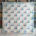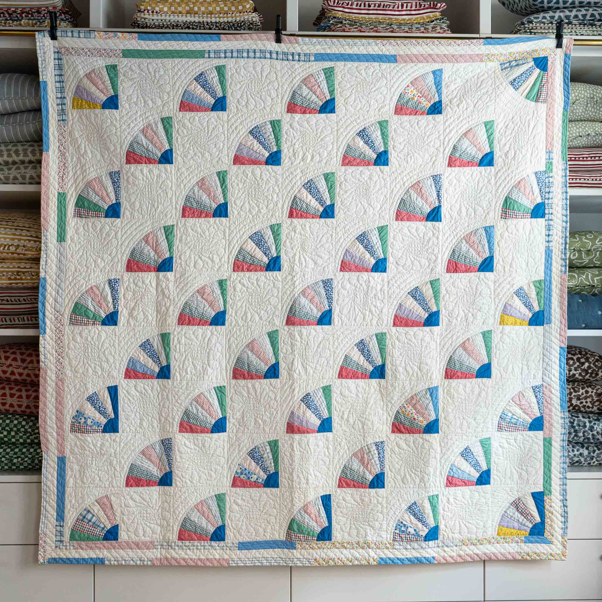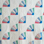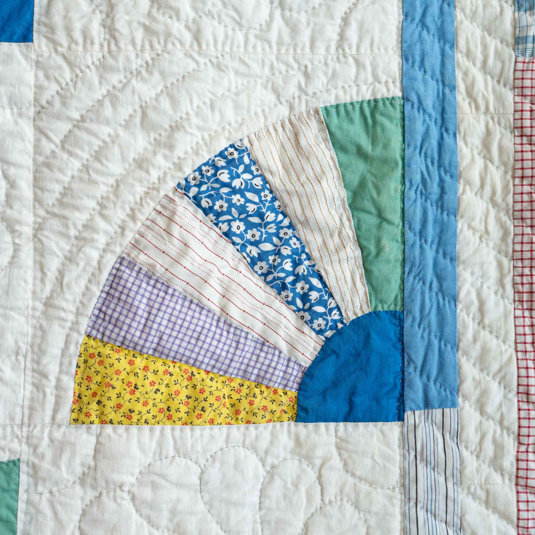 A Grandmother's Fan quilt from the 1930s–40s, pieced from a wide range of Depression-era cotton scraps in pink, cornflower blue, green, lavender, yellow, gingham, shirting stripes and small florals. The fans are all oriented in the same direction, giving the surface a calm, rhythmic quality; the eye moves across it in a single sweep.